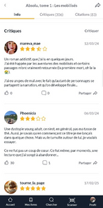 L'une des fonctionnalités les plus appréciées de Babelio est la possibilité de publier des critiques et des avis sur les livres que vous avez lus. Vous pouvez partager vos impressions, donner des notes et même ajouter des citations marquantes. Les avis des autres utilisateurs sont également consultables, ce qui permet de se faire une idée avant de commencer une nouvelle lecture. On peut aussi y apercevoir des livres similaires, la note moyenne, et je trouve que c’est vraiment sympa, comme ici avec le premier tome de la trilogie fantastique ‘Absolu’ (je vous la recommande vivement !).